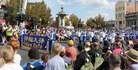 很多华人观众在夹道旁对正在走来的法轮功天国乐团拍照