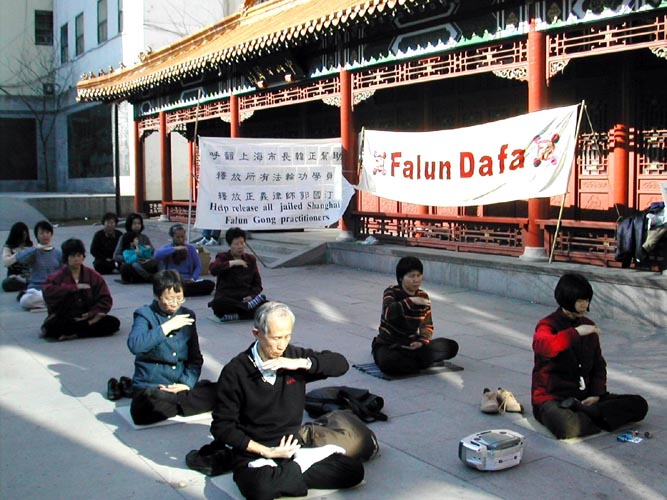 加拿大蒙特利尔市与上海市姊妹城市市长会面,法轮功学员和平请愿