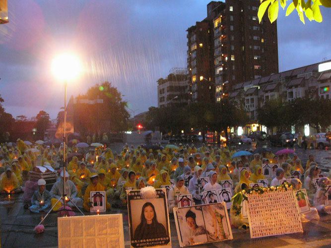 台中学员风雨中悼“7·20” 呼吁共同制止迫害 图为雨中烛光悼念会