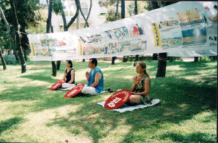 July 20 - Athens, capital of Greece. Falun Dafa practitioners went to the Chinese Embassy to protest Jiang Zemin regime's four-year ruthless persecution of Falun Gong. The Embassy's entrance door was tightly locked. Practitioners sent forth righteous thoughts to resolutely clear away all evil old forces in other dimensions that are persecuting Dafa and sentient beings and to save all beings who are savable.
