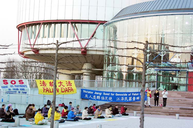 Practitioners hold peaceful appeal in front of European Union parliament to call for bringing Jiang Zemin to justice on December 17, 2003